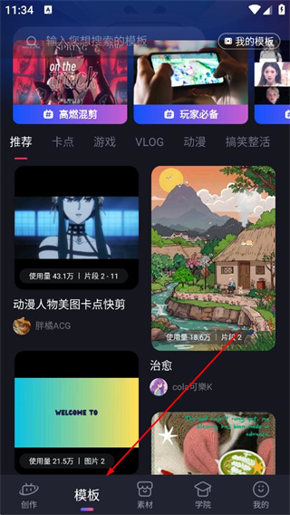 1、進入APP模板頁面瀏覽高燃混剪、玩家必備等分類模板,選擇治愈類模板,進入模板詳情頁面。