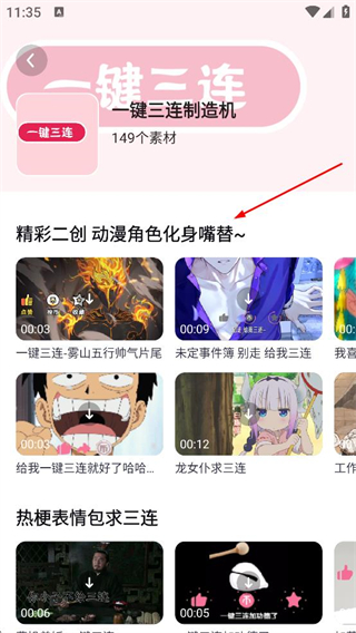 4、在一鍵三連制造機詳情頁面,瀏覽精彩二創、熱梗表情包求三連等素材,選擇需要的素材用于視頻創作。