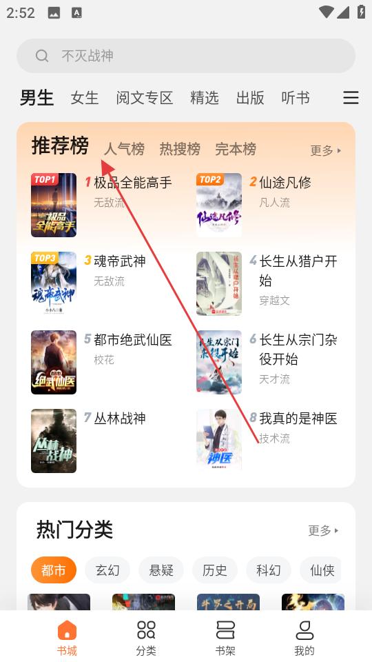1、進入書城頁面,在推薦榜板塊點擊人氣榜,瀏覽榜單上的小說,選擇感興趣的作品,如極品全能高手。