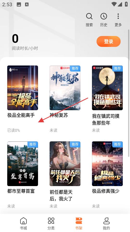 3、切換到書架頁面,找到已加入的極品全能高手小說,點擊封面即可開始閱讀,隨時續讀精彩內容。