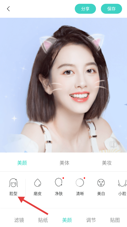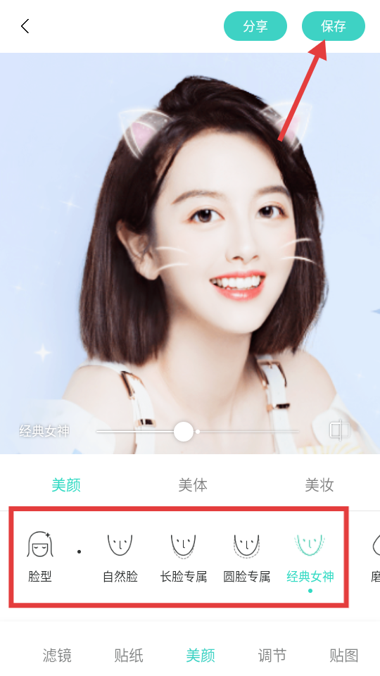 3、用戶選定臉型如選擇經典女神臉型,拖動調節條可微調效果強度,調整滿意后點擊右上角保存,就能留存調整臉型后的照片,同時也可分享給他人。