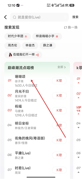 1、打開全民K歌軟件,在搜索發現頁面查看巔峰潮流點唱榜,選擇想要演唱的歌曲條目,點擊對應歌曲旁的K歌按鈕,進入歌曲詳情頁面。