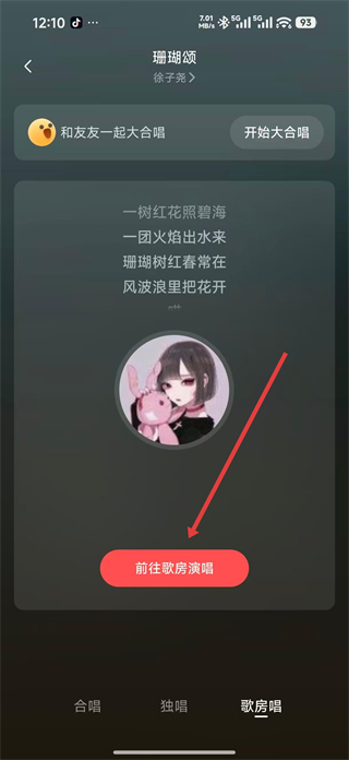 3、進入歌曲合唱界面選擇和好友一起大合唱選項,點擊前往歌房演唱按鈕,進入歌房準備界面,等待開啟合唱。