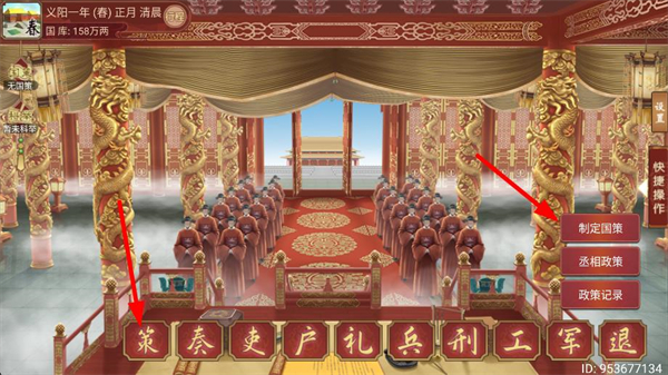 3、在宣政殿場景,可進行制定國策等操作,下方有策、奏、吏等功能選項,助力國家治理。