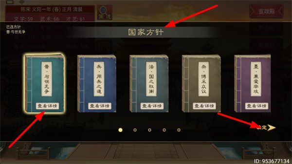 1、可選擇國家方針,如晉與民無爭等,點擊查看詳情了解方針內容,還可切換不同方針選項。
