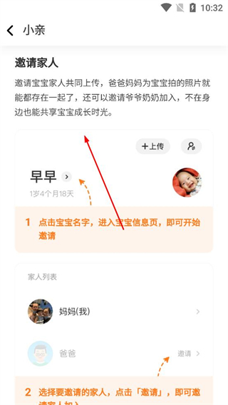 1、進入小親的邀請家人頁面,點擊寶寶名字進入寶寶信息頁,選擇要邀請的家人,點擊對應的邀請按鈕,進入邀請家人加入相冊頁面。