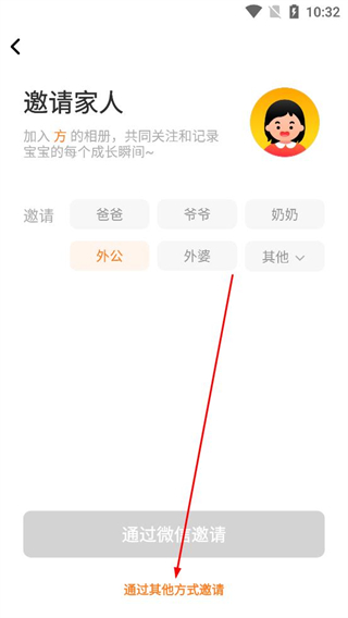 3、在邀請家人界面選擇要邀請的親屬身份如外公,確認身份后點擊通過其他方式邀請選項,打開邀請方式選擇彈窗。