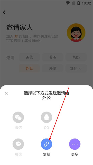 4、在邀請方式彈窗中選擇復制選項,將邀請鏈接復制下來,之后可通過對應渠道分享給外公,完成邀請操作的準備。