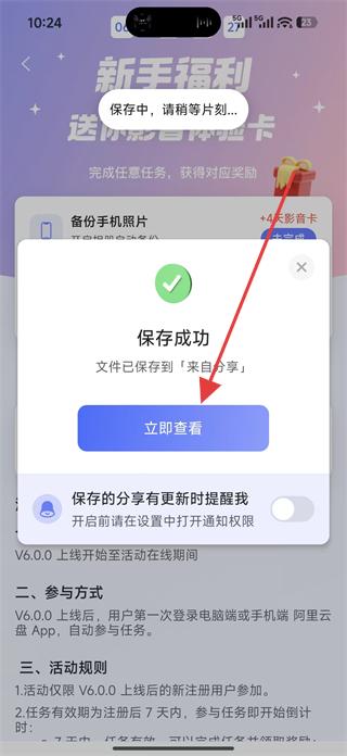 1、當文件保存成功后,點擊立即查看按鈕,即可查看已保存到來自分享的文件,以便確認文件保存情況。