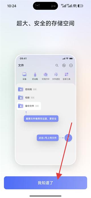 2、在展示超大安全的存儲空間的頁面中,點擊我知道了按鈕,完成該頁面關于存儲空間的操作提示,繼續后續操作。