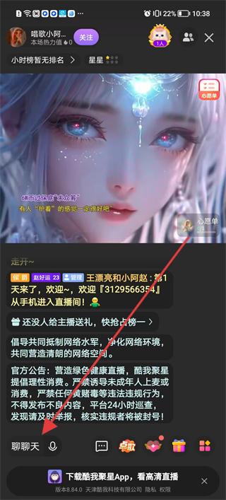 4、在直播間頁面可參與聊天互動,發送彈幕與主播和其他觀眾交流,也可查看直播間的公告和活動信息,享受直播的互動體驗。