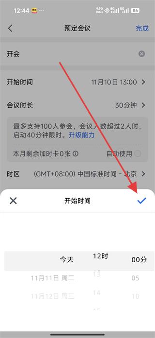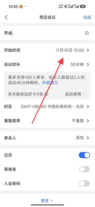 3、點擊開始時間選擇具體的開會時間,確認后返回預定會議頁面,繼續完善會議設置。