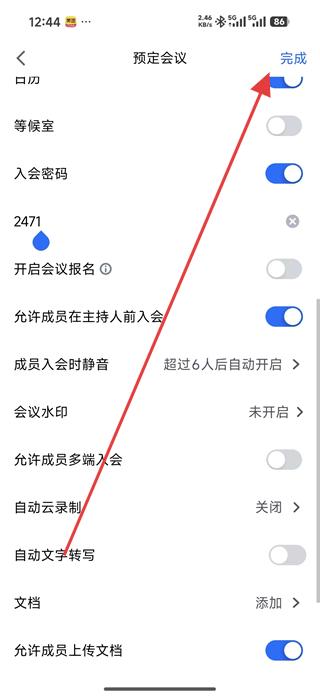 4、在預定會議頁面設置入會密碼、允許成員多端入會等高級選項,點擊完成,完成會議預定以便開展線上會議。