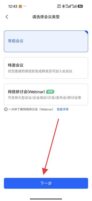1、進入騰訊會議APP會議類型選擇頁面,選擇常規會議,點擊下一步,進入預定會議流程。