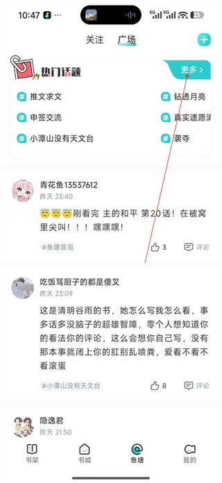 1、打開長佩閱讀軟件,進入魚塘頁面,瀏覽熱門話題下的動態內容,點擊更多按鈕,查看完整的熱門話題列表。