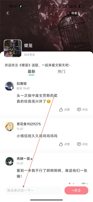 3、進入話題詳情頁后可瀏覽最新或熱門的動態,點擊輸入框,準備發布自己的討論內容參與互動。