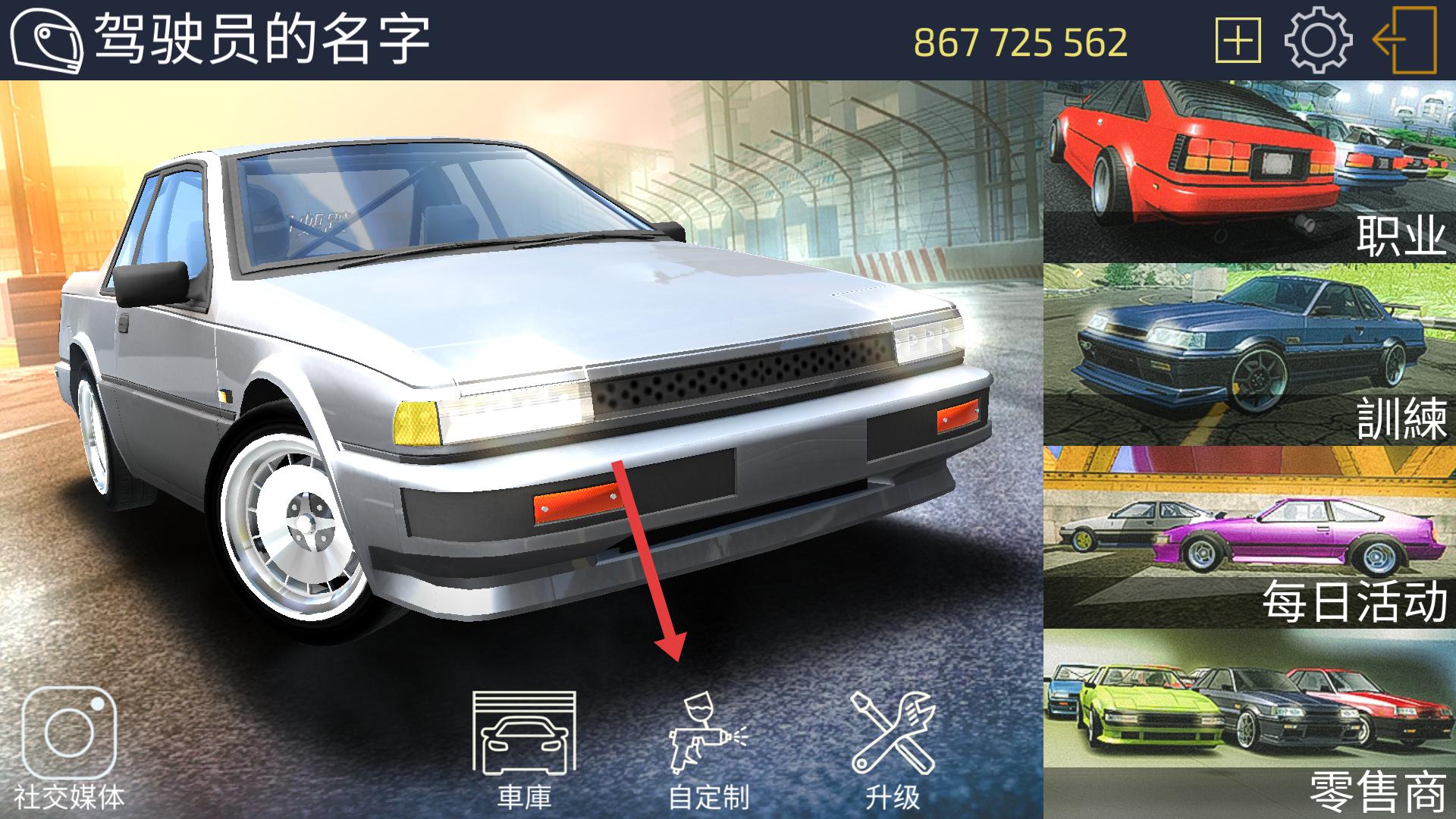 1、游戲界面有車輛展示和【自定制】選項,點擊該選項,可進入車輛自定制界面,開始對車輛進行個性化改造。