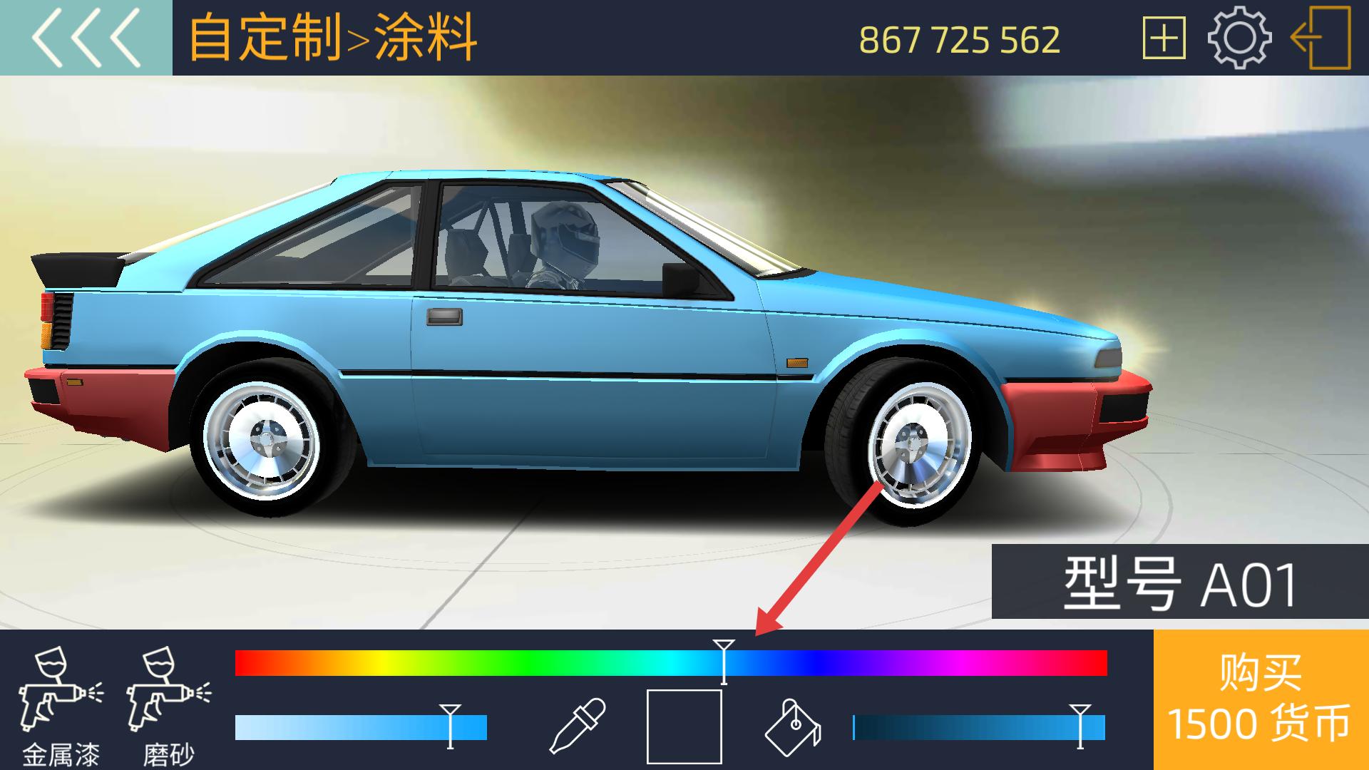 4、進入涂料界面,能選擇不同的涂料類型,如金屬漆、磨砂等,還可通過顏色條選色,給車輛整體或部分噴涂,改變車輛色彩風格。