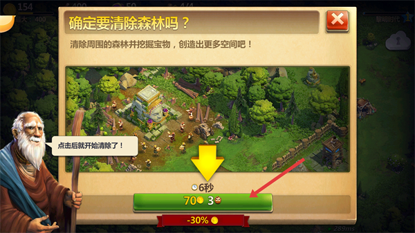 1、可清除森林,花費資源后等待時間即可開始清除,清除后能挖掘寶物并創造更多空間,助力部落發展。