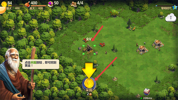 3、點擊采掘按鈕可挖掘黃金,獲取黃金資源,不斷積累資源,提升部落的發展潛力。