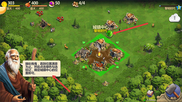 4、可拖拽城鎮中心到滿意位置,點擊綠色勾選標記確定位置,建設城鎮中心,推動部落進入新的發展時代。