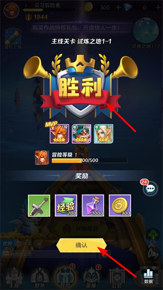 2、關卡勝利后點擊確認按鈕,領取武器、經驗、金幣等獎勵,提升冒險等級,解鎖新的英雄和玩法。