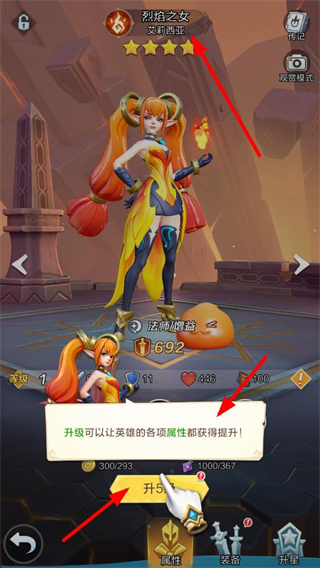 3、升級英雄烈焰之女角色,提升其攻擊、生命等屬性,增強英雄戰力,讓其在戰斗過程更具優勢。