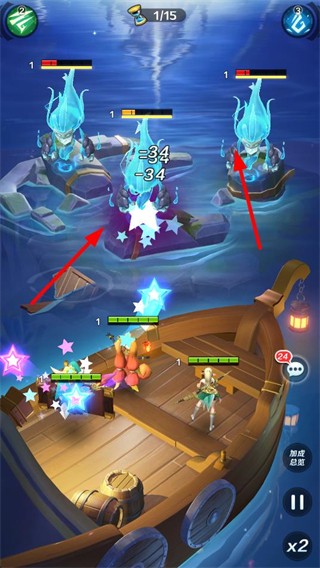 1、在海上戰斗時,操控角色攻擊藍色靈體敵人,擊敗敵人獲取經驗和資源,推進航海冒險進程。
