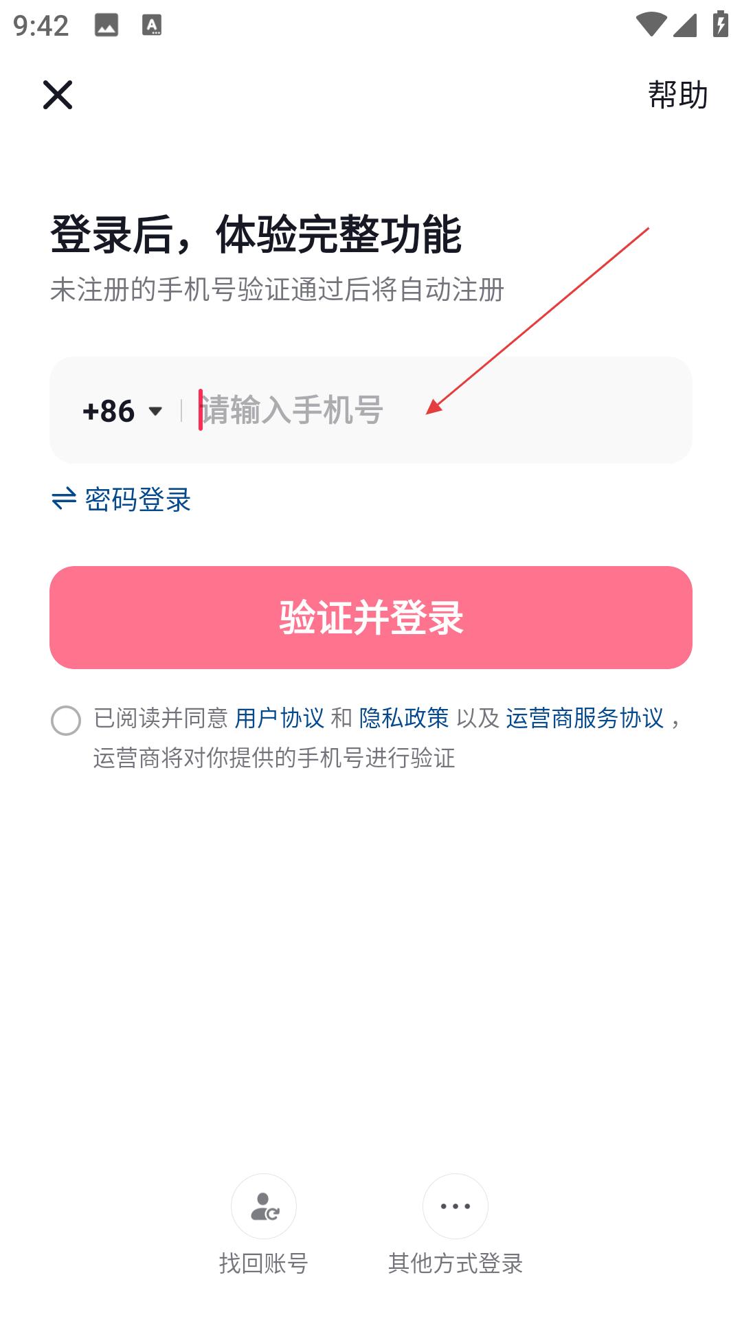 2、進入抖音登錄頁,填手機號,同意協議,點擊驗證登錄,或選找回賬號、其他方式,完成登錄。