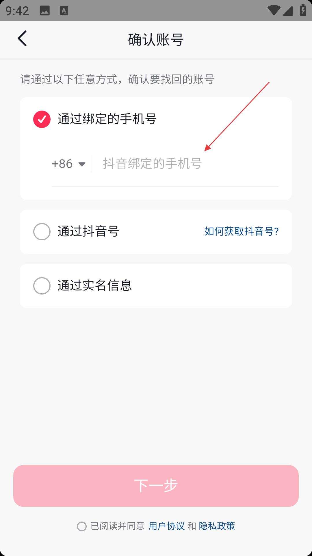 3、進入抖音確認賬號界面,選通過綁定手機號,填號碼,同意協議,點擊下一步,重置密碼等。