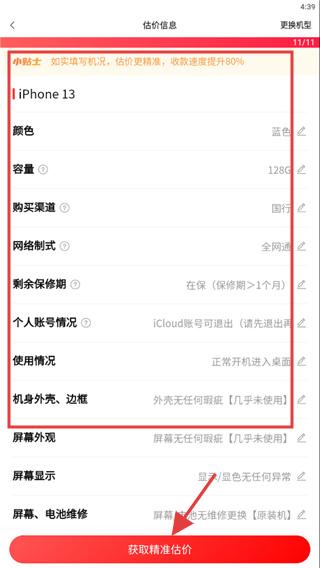 2、在估價信息頁面,準確填寫設備的各項信息,填寫完成后點擊獲取精準估價按鈕,等待系統計算估價。