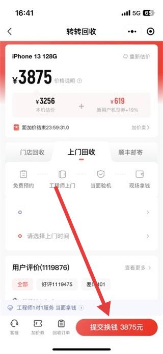 3、估價結果出來后選擇回收方式,確認價格無誤后點擊提交換錢按鈕,按后續提示完成回收流程。