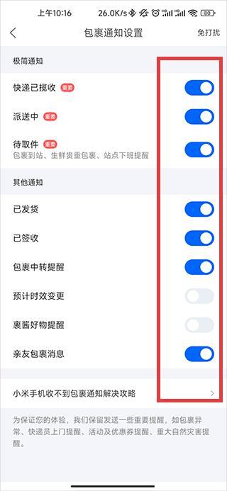 3、進入包裹消息通知頁面后,會看到豐富的設置項,像包裹發貨提醒、派送提醒、簽收提醒等不同物流節點的通知開關,根據自己的需求,勾選或調整對應的選項。