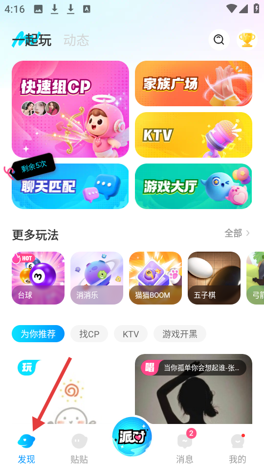 1、發現頁布局多彩,匯聚快速組CP、KTV等娛樂模塊,更有聊天匹配及多種熱門手游推薦,底部可切換頁面。