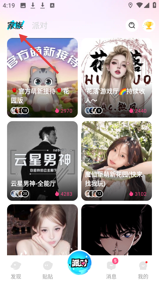 2、家族界面展示各類家族組織,家族與派對標簽鮮明,各家族以獨特海報呈現,附成員數等信息,方便用戶選擇加入。