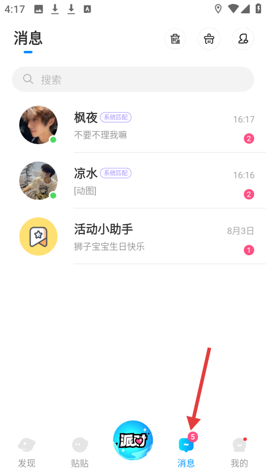 3、消息頁面展示系統匹配的聊天聯系人及對應消息,像楓夜、涼水的互動提示,還有活動小助手通知,紅點顯示未讀數量。