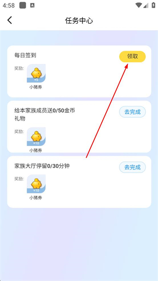 2、進入任務中心點擊每日簽到后的領取,獲取小豬券獎勵,也可完成給家族成員送禮物、家族大廳停留等任務,獲取更多獎勵。