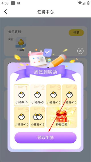 3、領取每日簽到獎勵后彈出周簽到獎勵彈窗,點擊領取獎勵,可查看周簽到的累計獎勵,如小豬券和神秘寶箱。