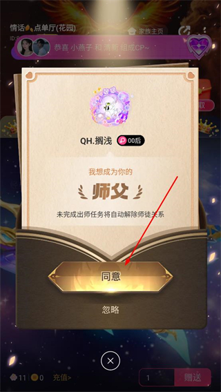 4、在家族內收到成為師父的邀請,點擊同意,建立師徒關系,參與師徒任務,也可忽略邀請,繼續其他社交互動。