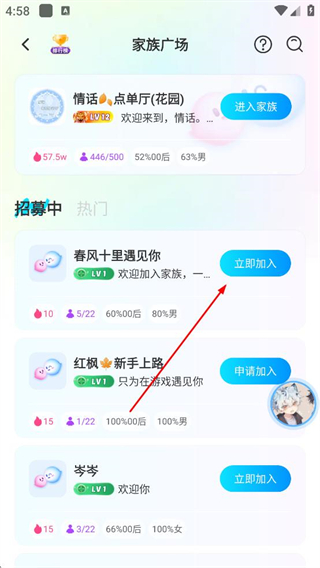 1、進入APP家族廣場頁面,選擇春風十里遇見你家族,點擊立即加入,成為該家族成員,參與家族活動。
