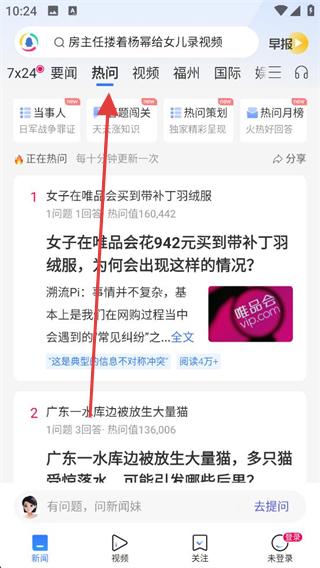 2、在APP內點擊熱詞板塊可查看正在熱問的新聞內容,如女子在唯品會買到帶補丁羽絨服的新聞。