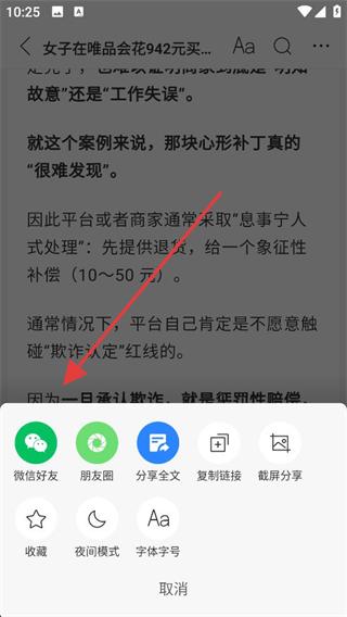 4、在分享頁面可選擇微信好友、朋友圈等分享渠道,也可選擇復制鏈接、截屏分享,還能設置收藏、夜間模式和字體字號。