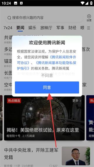 1、打開騰訊新聞APP閱讀并同意騰訊新聞軟件許可協議、騰訊新聞基本功能隱私保護指引相關條款后進入APP。
