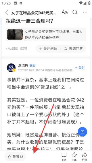 3、進入該新聞詳情頁可查看網友對拒絕退一賠三是否合理的討論,還能對新聞內容進行贊同、評論和收藏操作。