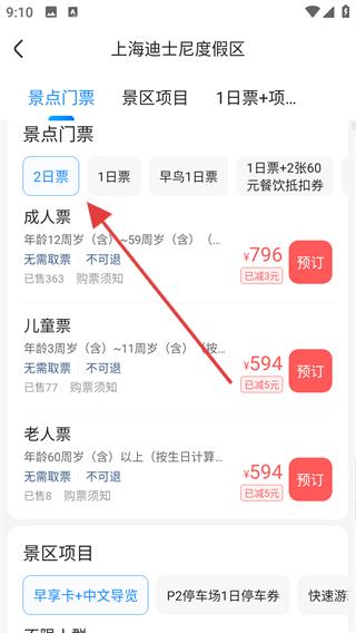 3、在景點門票板塊選擇門票類型,比如2日票,然后在成年人票、兒童票、老人票等不同人群票種,選擇要預訂的票種。
