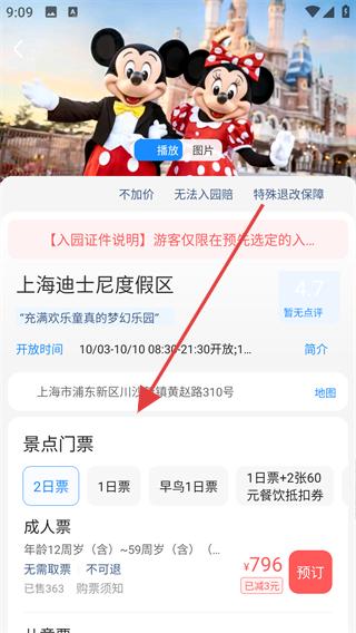 2、點擊上海迪士尼度假區,進入該度假區詳情頁面,可查看度假區簡介、開放時間等信息,下方還有景點門票板塊。