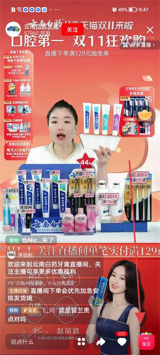 3、進入直播詳情頁觀看云南白藥牙膏的直播,了解直播的商品介紹與優惠活動,參與直播互動,豐富購物體驗。