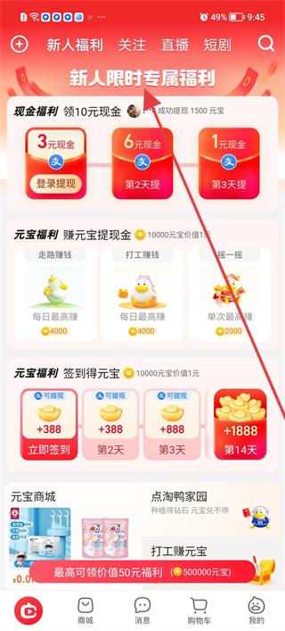 1、進入軟件首頁查看新人限時專屬福利,如現金福利領10元現金、元寶福利賺元寶提現金等,開啟購物與福利體驗。