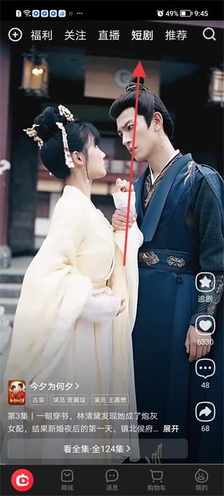 4、點擊短劇板塊瀏覽推薦的短劇內容,如一朝穿書的古裝短劇,了解短劇的集數與劇情簡介,點擊追劇或點贊,參與短劇觀看與互動。