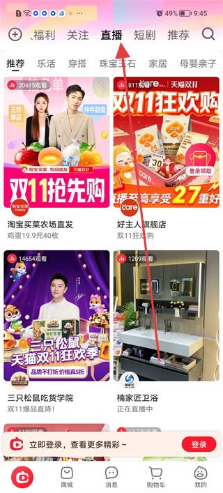 2、點擊直播板塊瀏覽推薦的直播內容,如雙11搶先購、好主人旗艦店等直播,了解直播的商品優惠與活動,挑選感興趣的直播,參與直播購物,提升購物性價比。